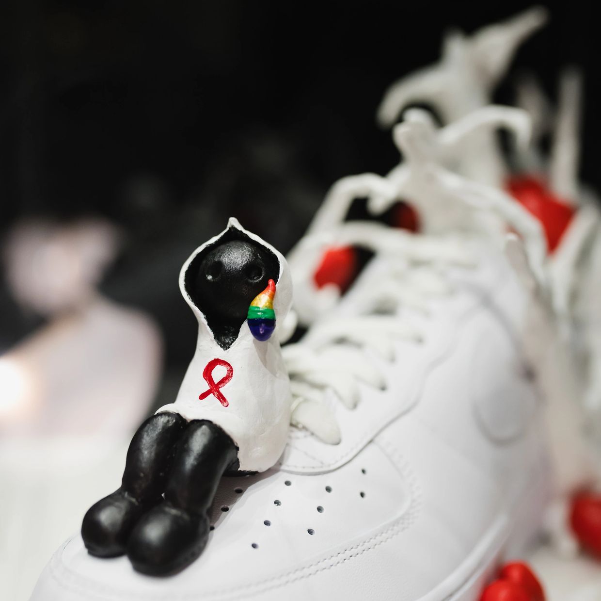 Jasmin Machell crafted this shoe for HIV/AIDS awareness, tell a story of strength, connection, and community. The distressed denim symbolizes the impact of the disease, reflecting its ability to fray live; denim hearts are stitched together to signify unity and support reminding us that no one fights alone. Denim, "America's fabric," further symbolizes our shared responsibility to care for and uplift one another. Through every step, these soles carry a message of resilience and connection.
